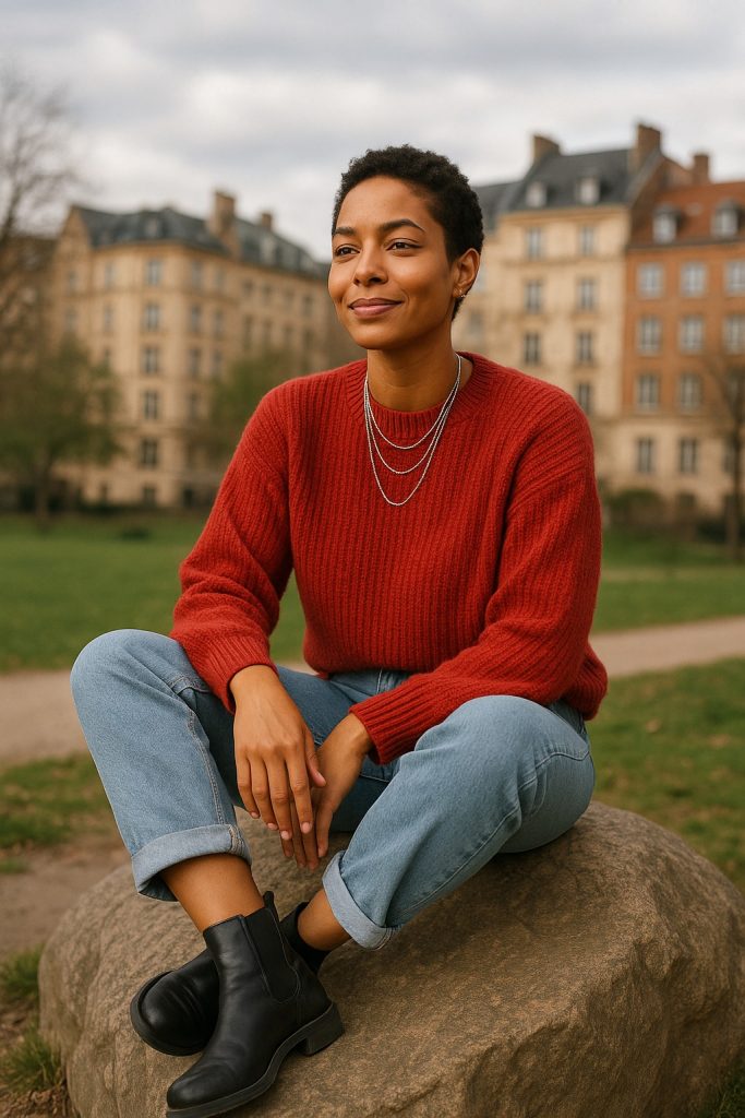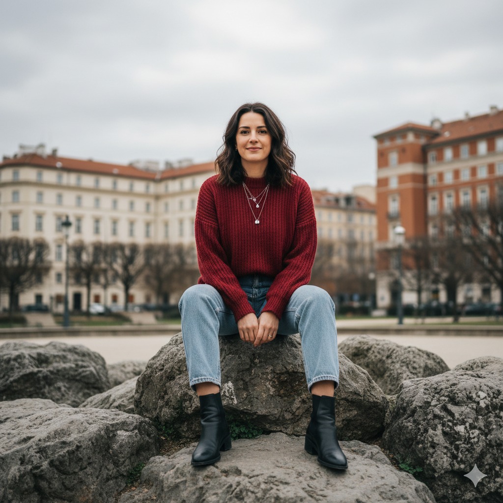 A confident woman sitting casually on a large rock in a city park, wearing a cozy red sweater, light blue jeans, and black ankle boots. She smiles calmly while looking ahead, with layered silver necklaces adding a stylish touch. The background shows soft-focus European-style buildings with beige and brick tones under a cloudy sky. The atmosphere feels natural, relaxed, and modern — capturing balance between urban life and tranquility.