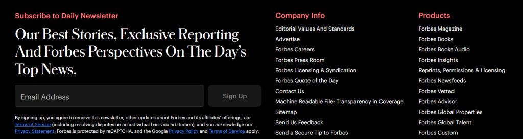This image showcases the footer section of the Forbes website, which is designed with a sleek black background and clear typographic hierarchy. The section is divided into three primary columns, each serving a distinct informational purpose: